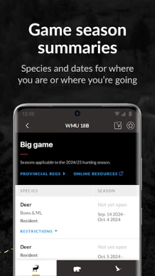 • Access to select hunting zones to view summaries of big-game, predators, game birds, and small game seasons (works offline).