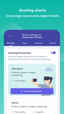 Monitors the camera on your child’s device, prevents them from sharing inappropriate photos, and notifies you immediately if a risky photo is detected