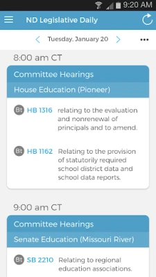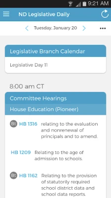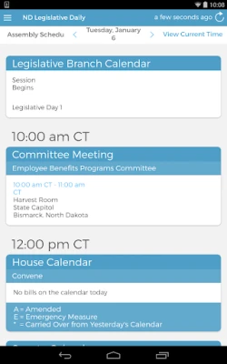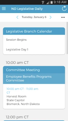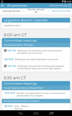 Follow the North Dakota Legislative Assembly events during the legislative session (committee hearings, floor sessions, and conference committees) and the legislative interim (interim committee meetings and agency administrative rule hearings). This app provides access to bill and amendment documents and bill status information. This app allows you view your own personalized schedule by linking the app to your online Legislative Bill Tracking System account.