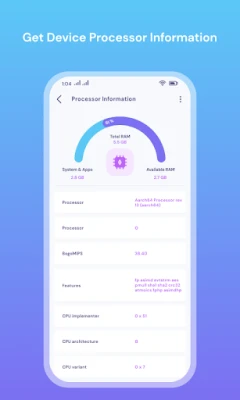 - Processor Information : know what processor your phone is using, how much memory is used by system apps and more.